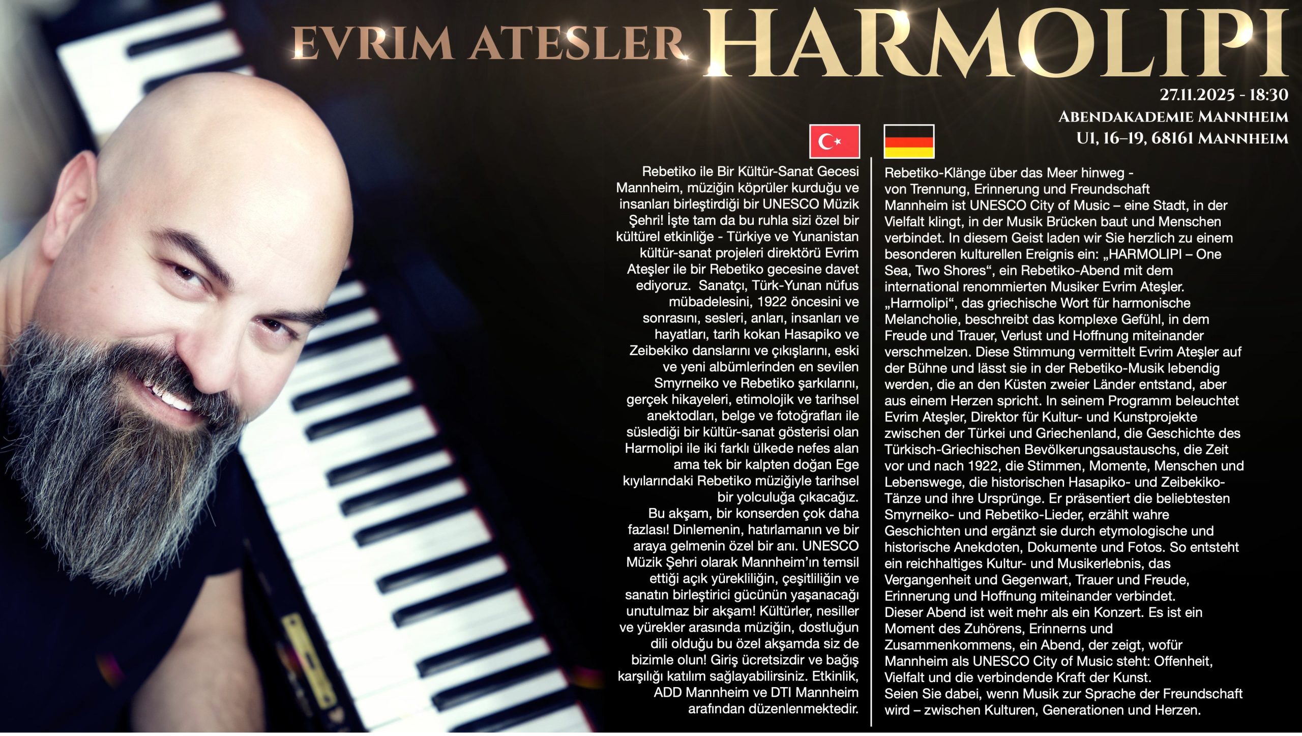Mannheimer AbendakademieHARMOLIPI Rebetiko-Klänge – von Trennung, Erinnerung und Freundschaft am Donnerstag, 27. November 2025 um 18:30 Uhr in der Abendakademie Mannheim (U1, 16–19, 68161 Mannheim, Saal). Mannheim ist UNESCO City of Music – eine Stadt, in der Vielfalt hörbar ist, in der Musik Brücken baut und Menschen verbindet. In diesem Geiste laden wir Sie herzlich zu […]